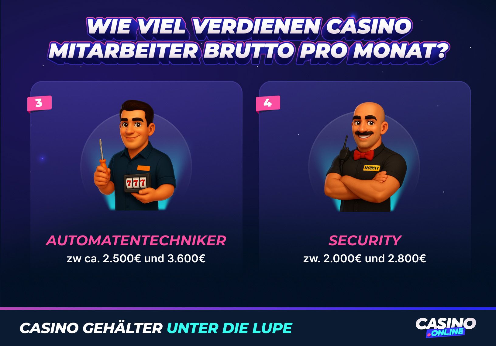 Sie arbeiten meist im Hintergrund, sind aber absolut entscheidend für den Schutz von Spielern, Besuchern, Mitarbeitern und Geldtransaktionen. Ihre Casinogehälter variieren stark je nach Casino-Größe und Verantwortungsbereich, liegen aber typischerweise im unteren bis mittleren Segment. Die Gehaltszufriedenheit hängt oft von den Arbeitszeiten und Zusatzleistungen ab.