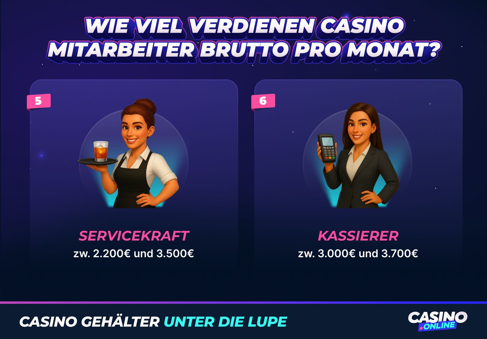 Servicekräfte sorgen für Getränke, Snacks und den ersten positiven Eindruck bei den Besuchern und Spielern. Der Stundenlohn ist meist eher bescheiden, wird aber oft durch großzügige Trinkgelder ergänzt. Für viele ist diese Rolle der ideale Einstieg in die faszinierende Casino-Welt und eröffnet weitere Berufsmöglichkeiten.