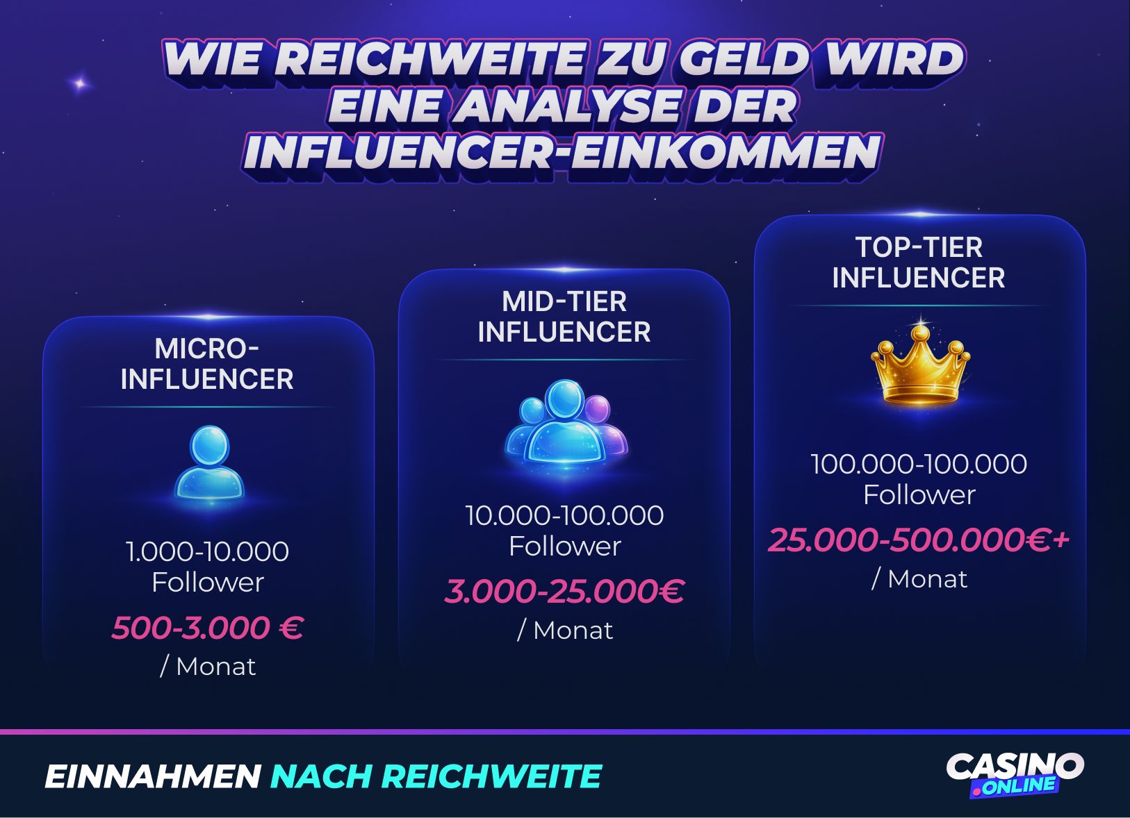 Das variiert stark nach Reichweite und Engagement. Ein Micro-Influencer (1.000-10.000 Follower) verdient etwa 500-3.000€ monatlich, während Mid-Tier Influencer (10.000-100.000 Follower) zwischen 3.000-25.000€ erzielen können. Top-Tier Influencer mit über 100.000 Followern können monatlich 25.000€ bis zu mehreren hunderttausend Euro verdienen - hauptsächlich durch Affiliate-Provisionen und exklusive Casino-Partnerschaften.